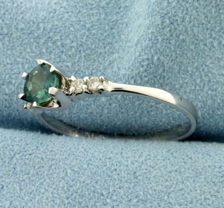 In 14k white gold. Contains 1/2ct high quality natural green tourmaline gemstones with bright green color. Also contains four .02ct high quality diamonds in shank of SI clarity/H color. Size 8 1/2. 1.8g.