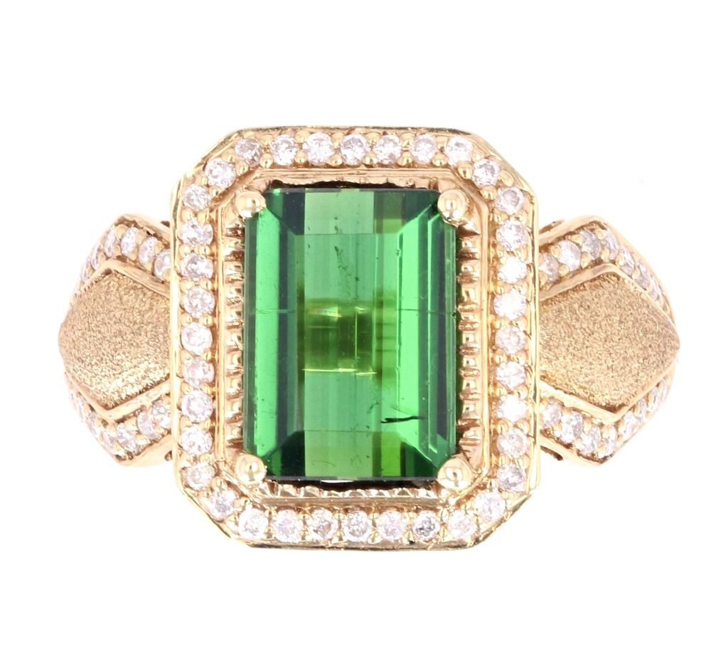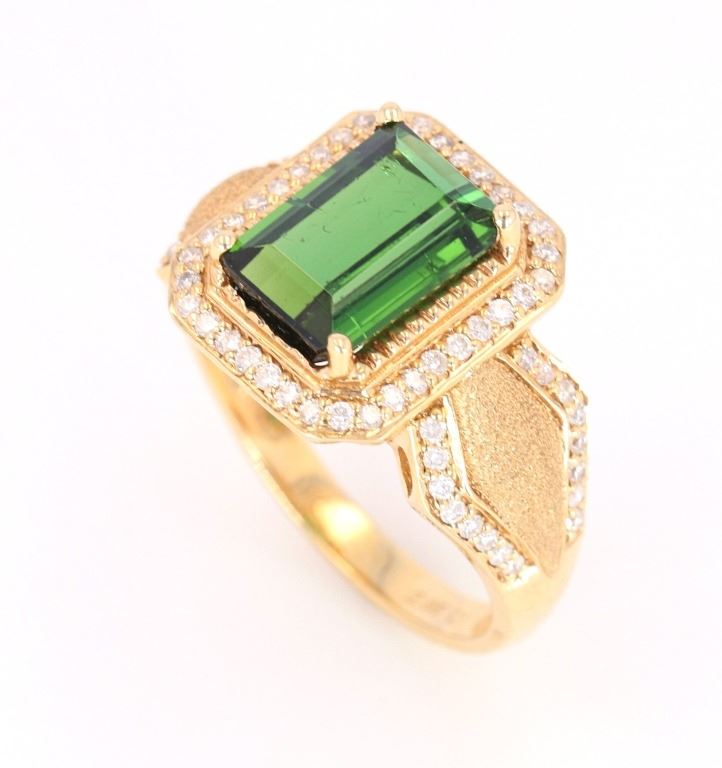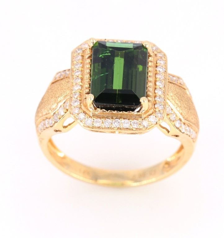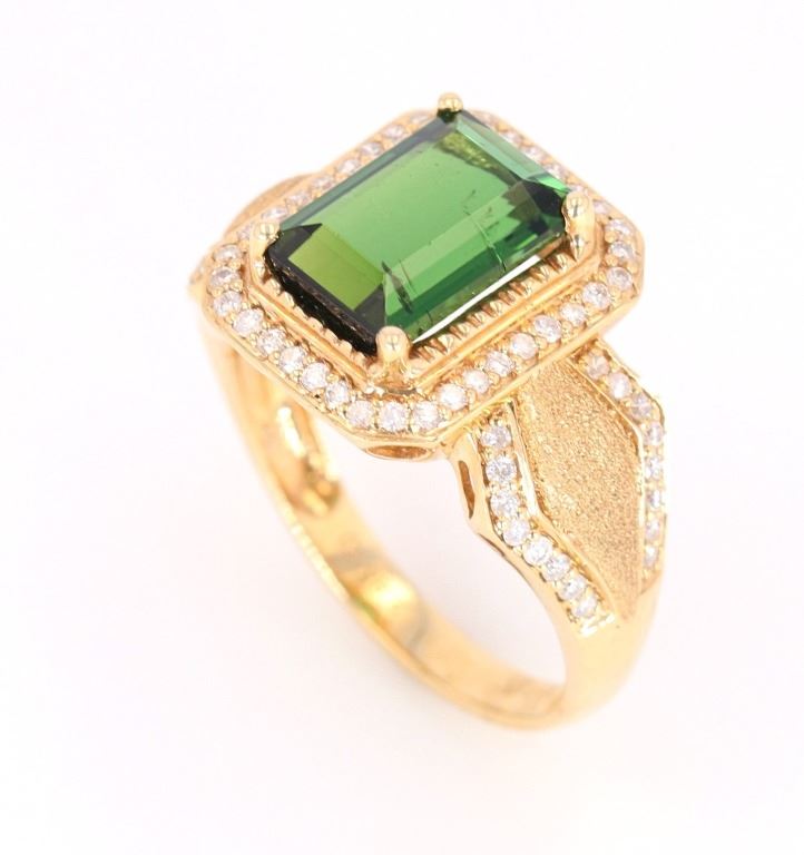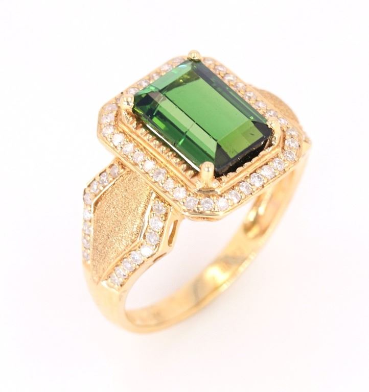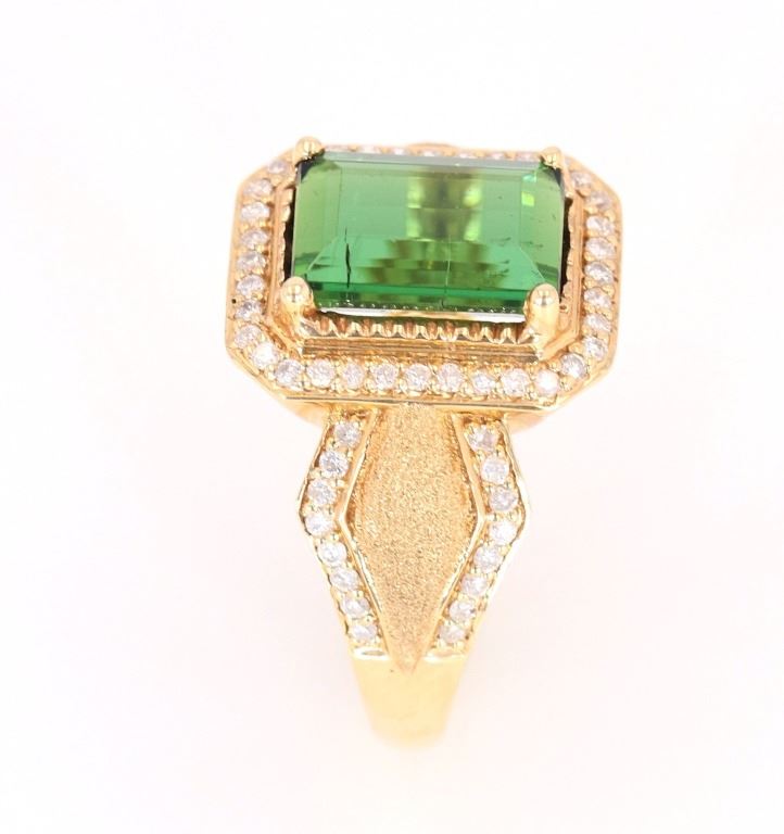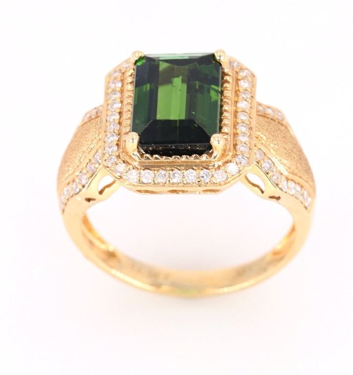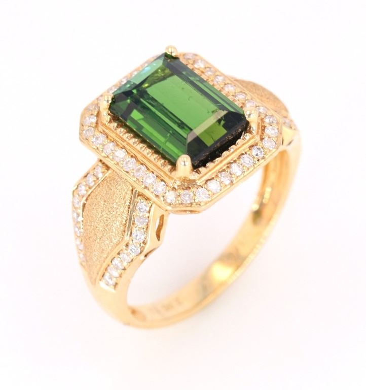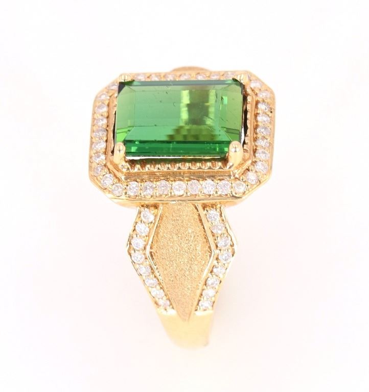 The lot features a rare Green Tourmaline set with Diamonds in a 14K gold ring. At the center shows an emerald cut Green Tourmaline with incredible depth and unique green coloring with fine eye clarity having a weight of 2.95 carats. The ring also shows a double halo bezel with unique band set with 68 round brilliant cut Diamonds with weight of 0.36 carats. The ring has a size of 7 US and a weight of 4.24 grams.