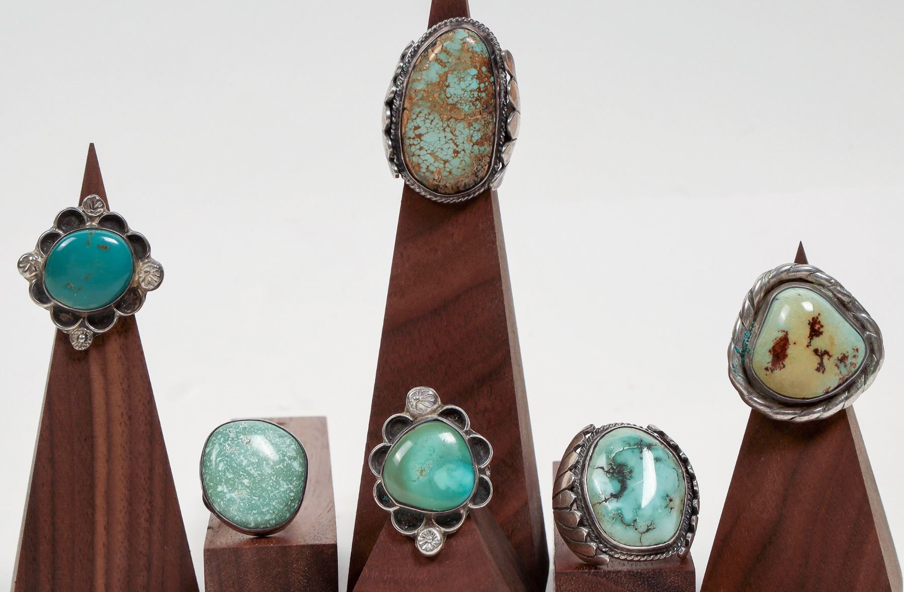 Six silver rings with green hued stones. Ring sizes as pictured from left to right: 6, 7.5, 8, 6, 9.5, 8.5 [] [] [] [] []