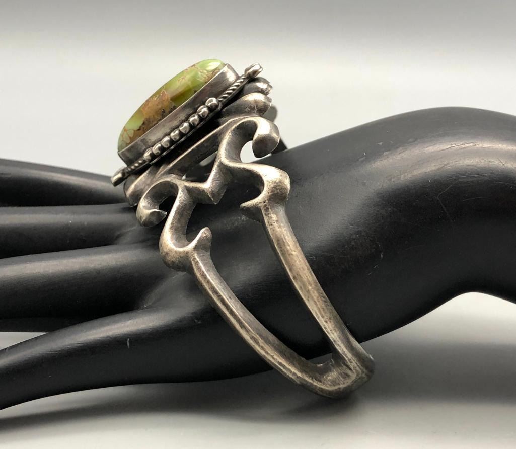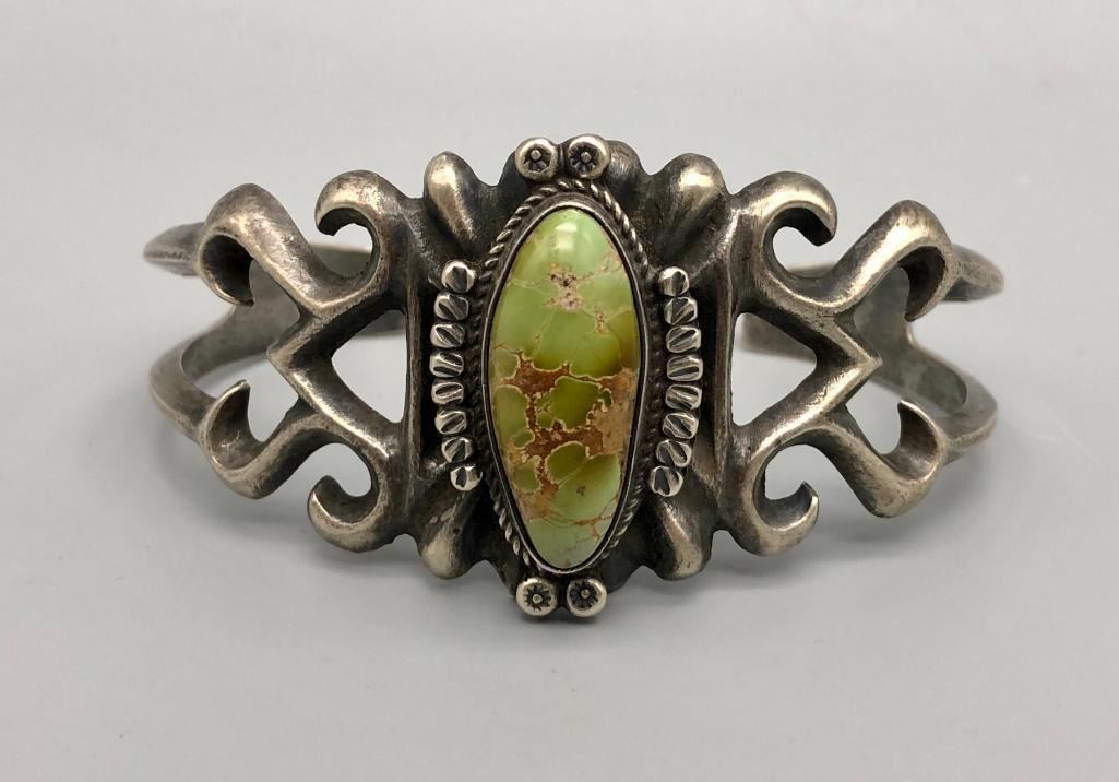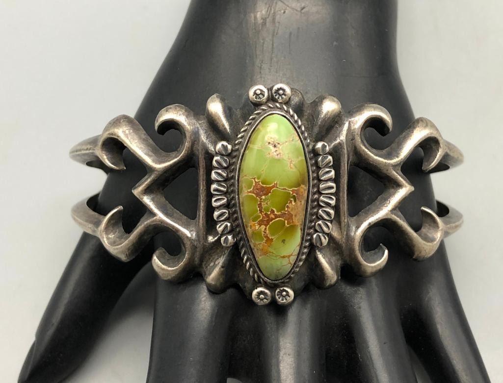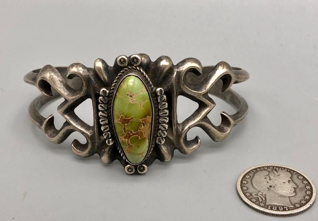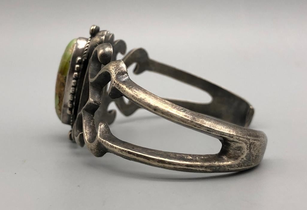 Offered for sale in this lot is a large turquoise and sandcast bracelet. This great bracelet is set with a cool green turquoise cabochon, surrounded with fine twisted wire and stamped silver dots. It is on a sturdy sandcast bracelet, that has a nice weight to it. It is stamped as sterling silver. MAKER: Hallmarked S/ and F.L.Begay. Dean Sandoval and F.L. Begay (both are Navajo). APPROX AGE: Contemporary. SIZE: Inside circumference measures 6-3/4 inches long. Opening is an additional 1-1/2 inches, fitting a 8-1/4 inch wrist. Width is 1-1/2 inches. Weighs 73 grams. CONDITION: Good for its age, normal wear expected. Please look closely at the pictures as they are an important part of our description and are hereby incorporated into the description, specifically with regards to condition. SHIPPING: There will be a $5 handling / packaging fee for shipping this lot. The actual cost of postage will be added on top of that. BUY IT NOW: If you would like to buy this item now, without waiting for the auction day to bid on it, we do offer this option (which is available up to 48 hours before the actual auction starts). The “Buy it Now†price is the high estimate of this lot (plus applicable fees and the Buyer's premium is discounted to 10% when using the Buy it Now option). If you would like to exercise this option, you must contact us by email (or phone as long as you talk to someone live). Reference this lot number and your intention to "Buy it Now."