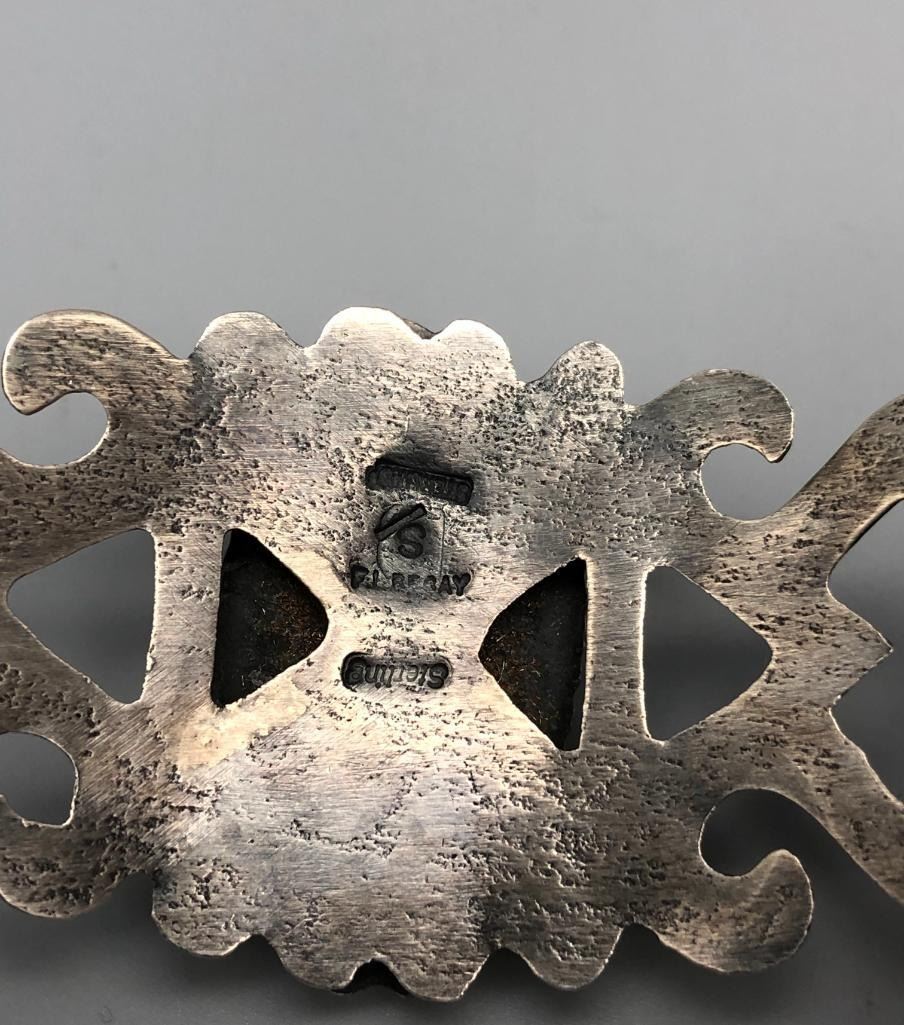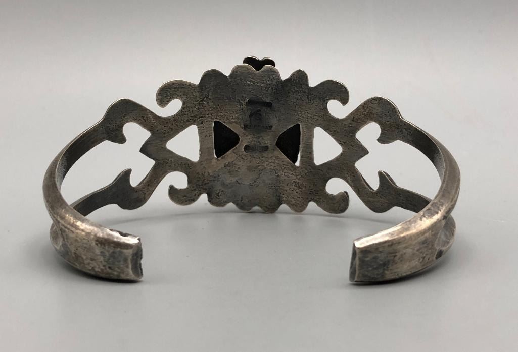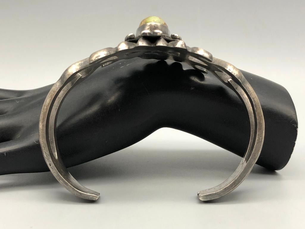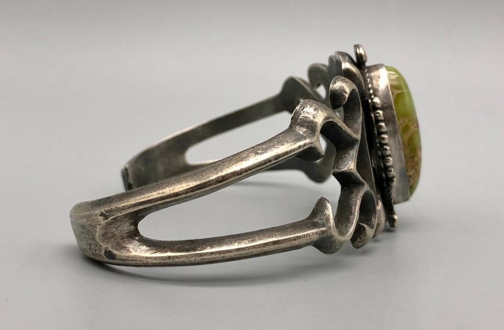 Offered for sale in this lot is a large turquoise and sandcast bracelet. This great bracelet is set with a cool green turquoise cabochon, surrounded with fine twisted wire and stamped silver dots. It is on a sturdy sandcast bracelet, that has a nice weight to it. It is stamped as sterling silver. MAKER: Hallmarked S/ and F.L.Begay. Dean Sandoval and F.L. Begay (both are Navajo). APPROX AGE: Contemporary. SIZE: Inside circumference measures 6-3/4 inches long. Opening is an additional 1-1/2 inches, fitting a 8-1/4 inch wrist. Width is 1-1/2 inches. Weighs 73 grams. CONDITION: Good for its age, normal wear expected. Please look closely at the pictures as they are an important part of our description and are hereby incorporated into the description, specifically with regards to condition. SHIPPING: There will be a $5 handling / packaging fee for shipping this lot. The actual cost of postage will be added on top of that. BUY IT NOW: If you would like to buy this item now, without waiting for the auction day to bid on it, we do offer this option (which is available up to 48 hours before the actual auction starts). The “Buy it Now†price is the high estimate of this lot (plus applicable fees and the Buyer's premium is discounted to 10% when using the Buy it Now option). If you would like to exercise this option, you must contact us by email (or phone as long as you talk to someone live). Reference this lot number and your intention to "Buy it Now."