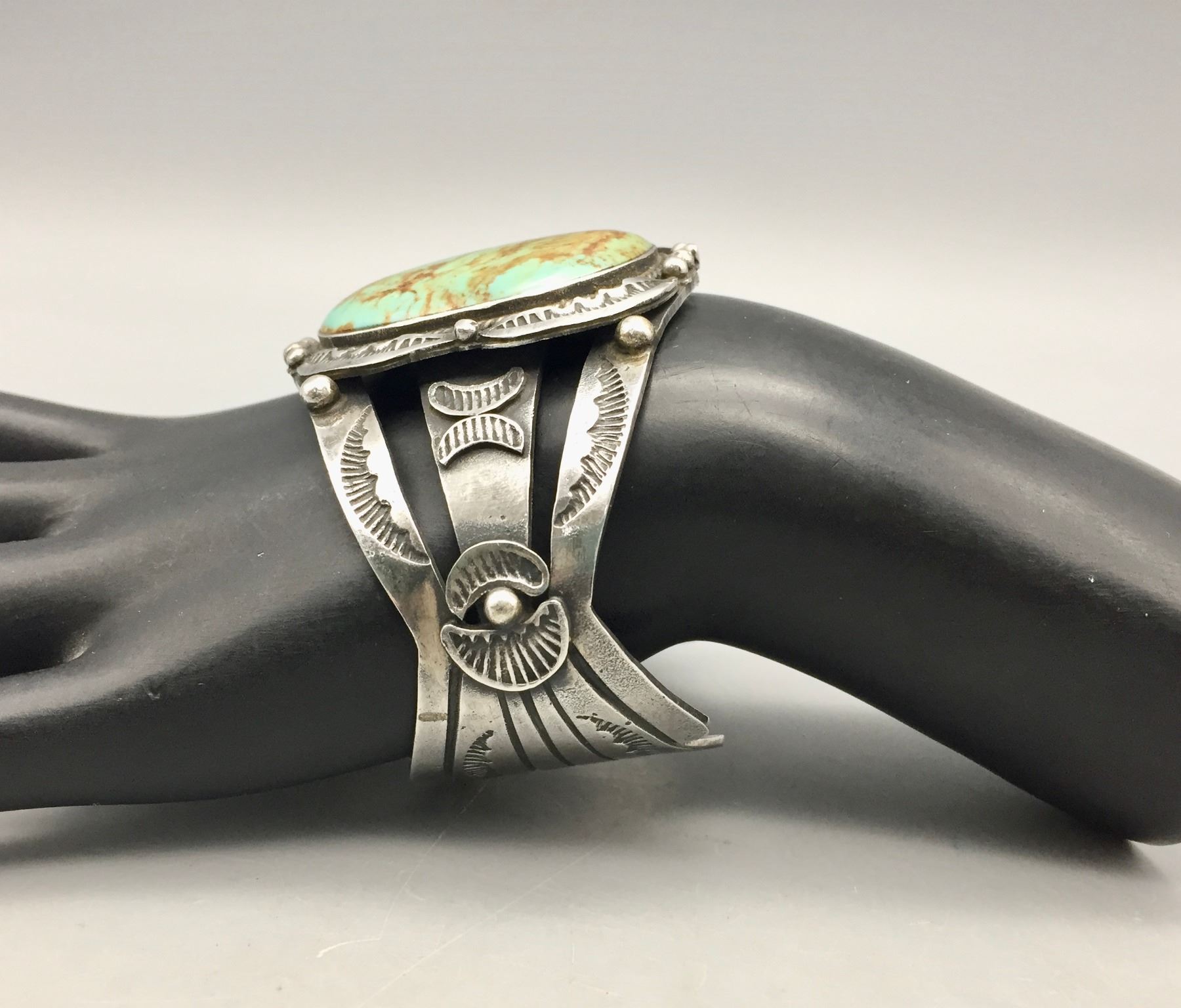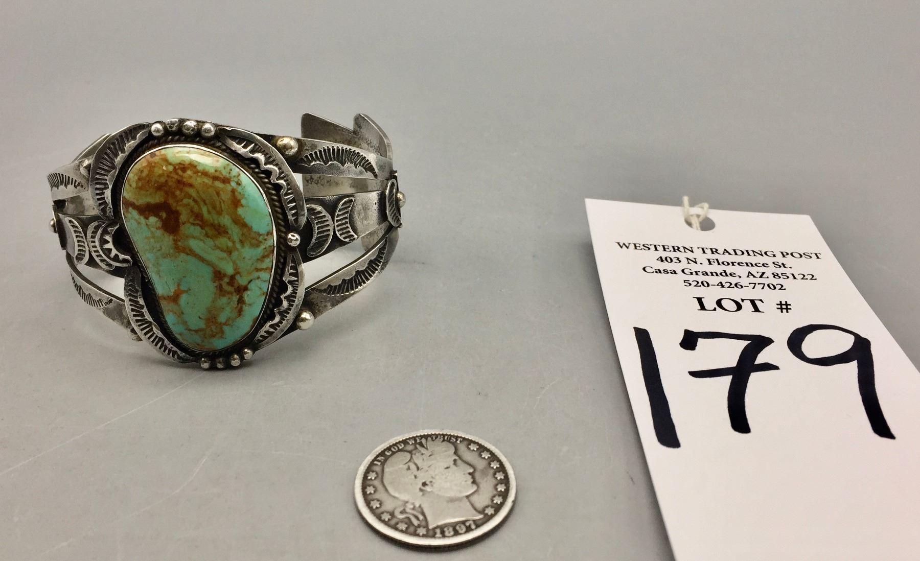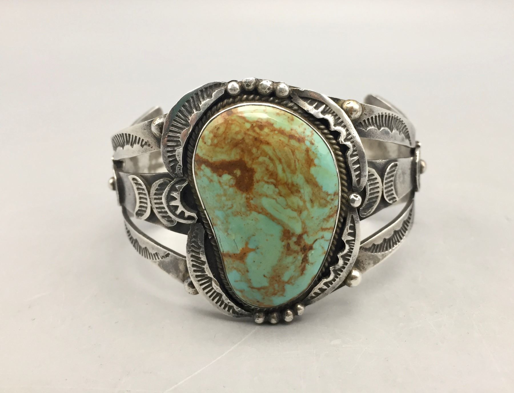 Description: Available in this lot is a sterling silver bracelet featuring a green turquoise cabochon with a brownish matrix. Marked as sterling silver.