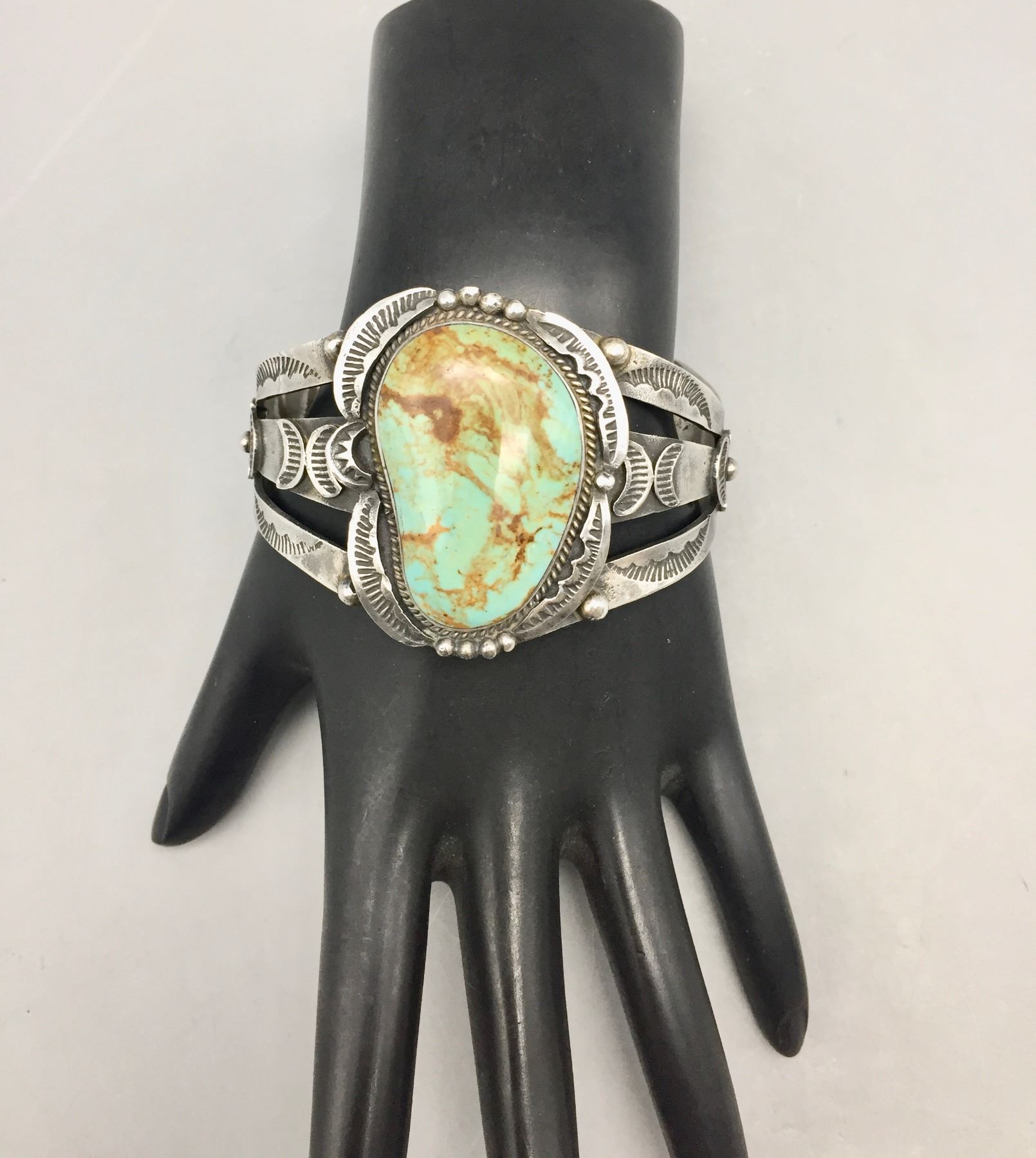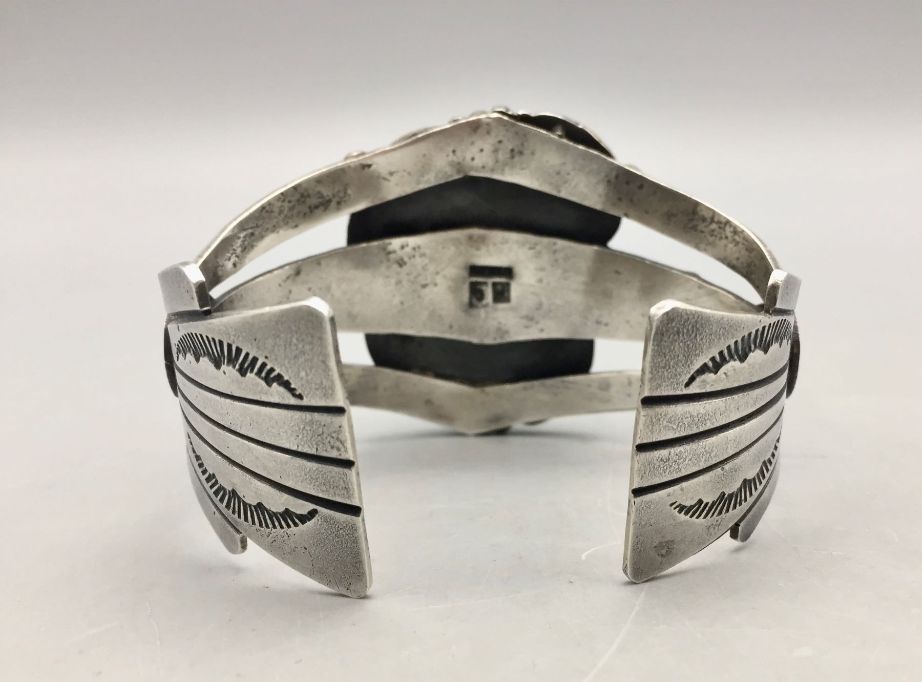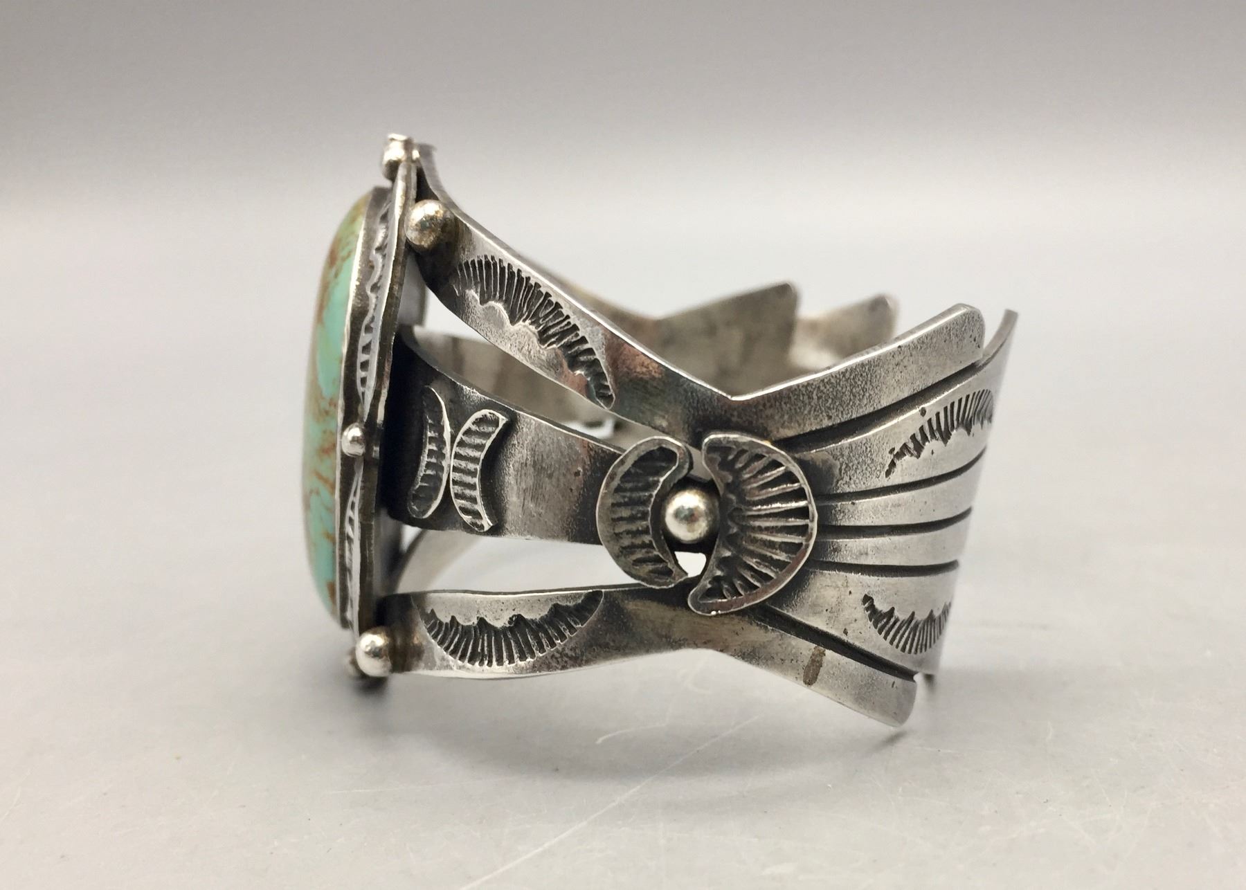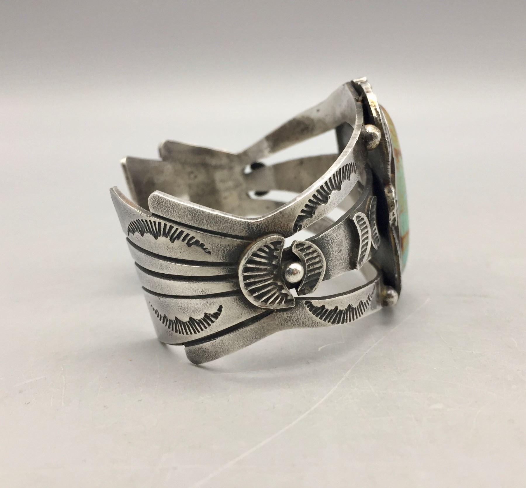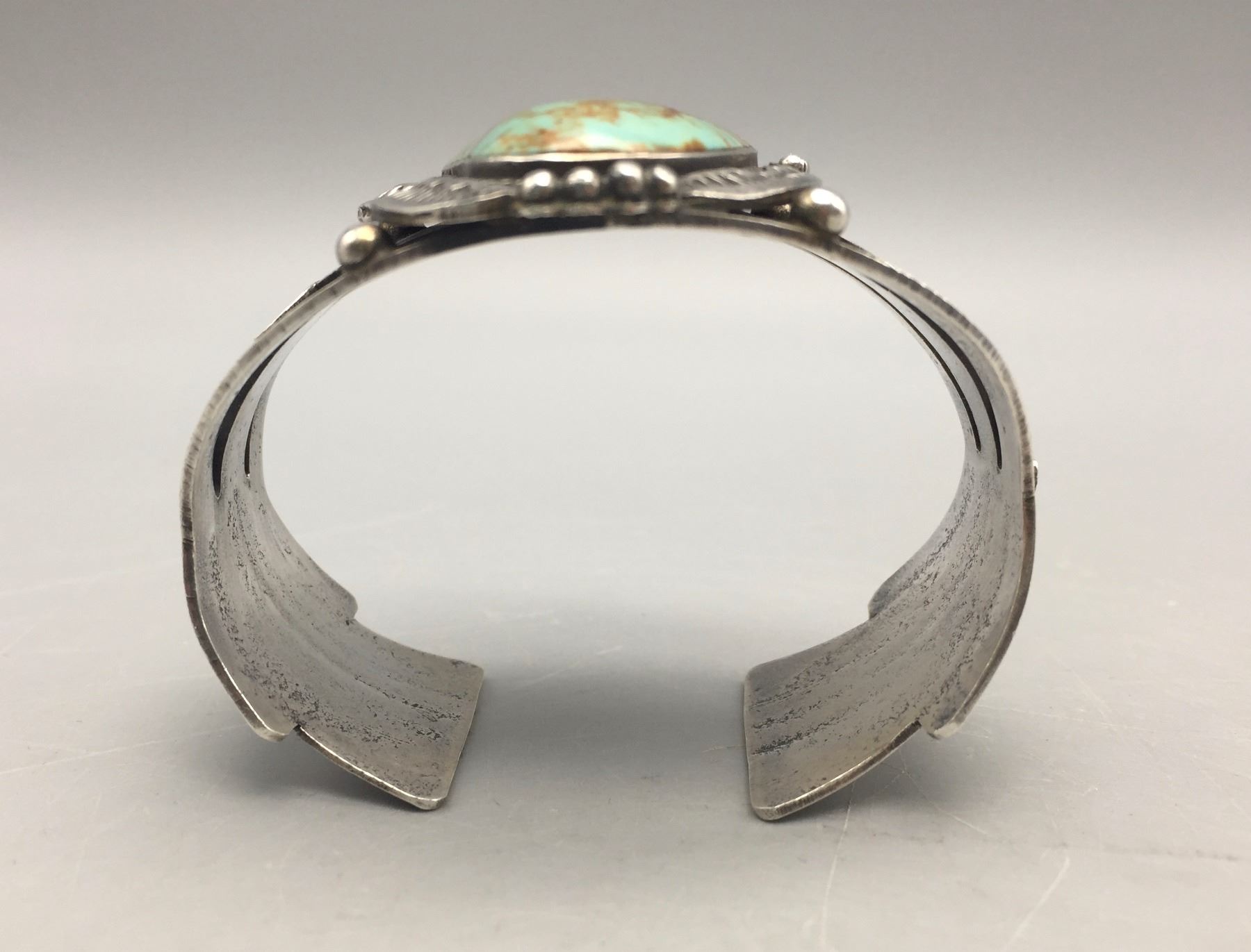 Size: Measures 5-7/8" with a 1" opening, (fits a 6-7/8"wrist). Is 1-7/8" wide. Weighs 66.2 grams. Condition: Good for its age, normal wear expected. Please look closely at the pictures - they are an important part of our description.