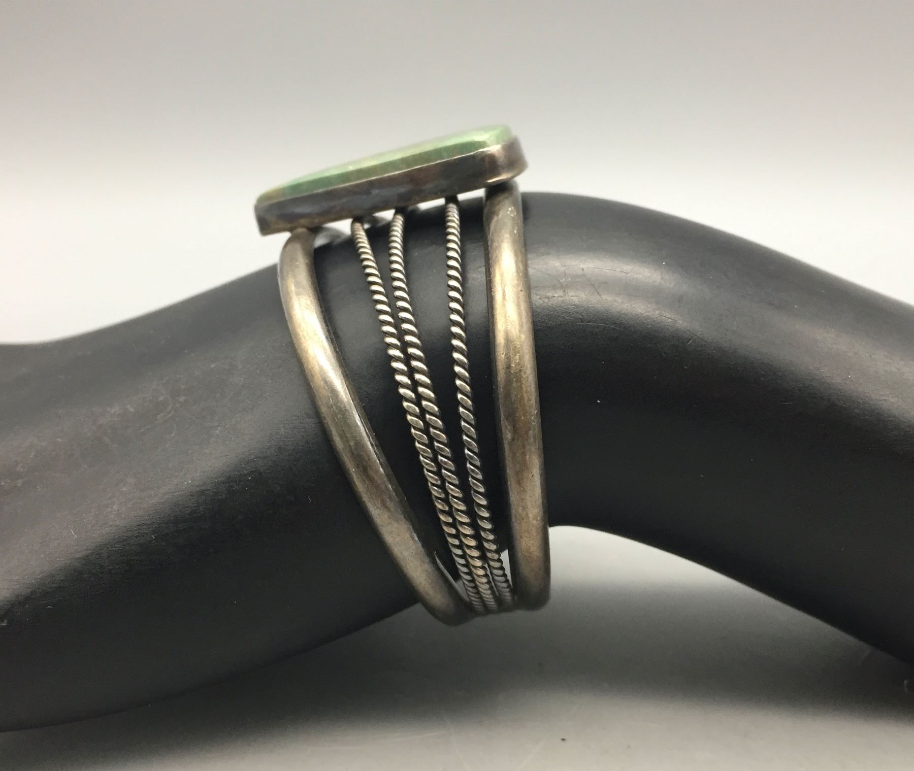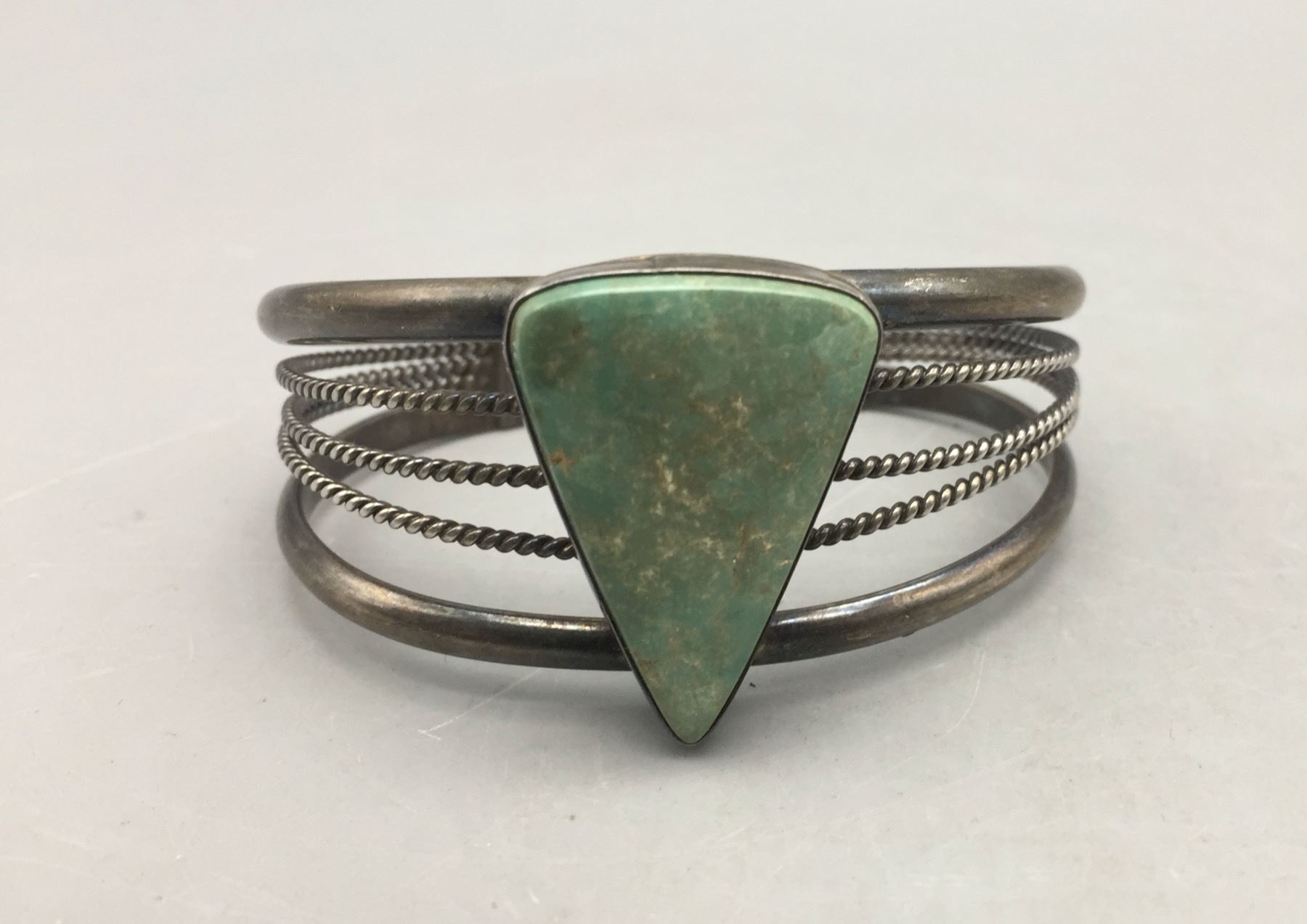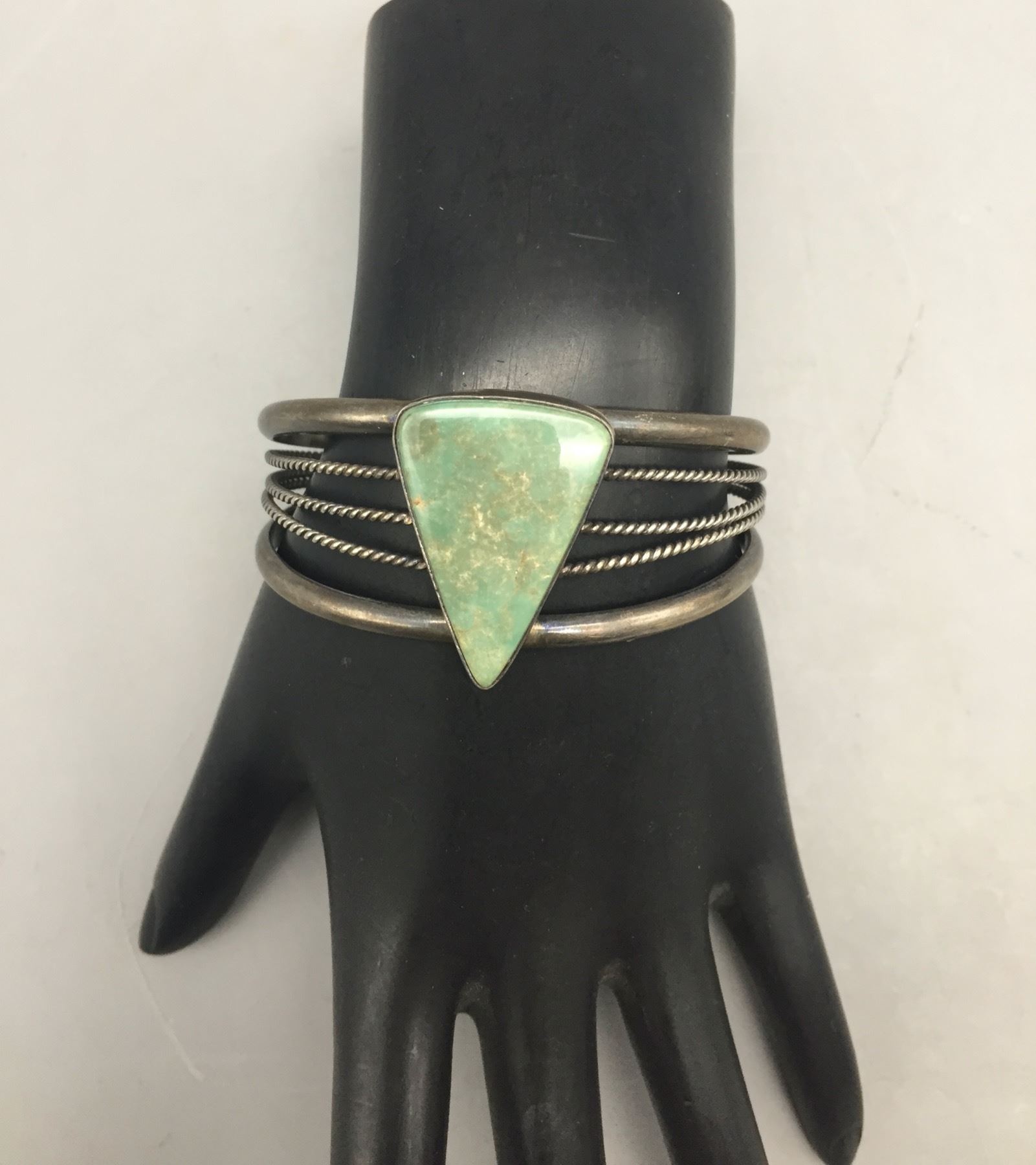 Description: For sale in this lot is a green turquoise bracelet, set with a triangle shaped stone. Tested as sterling silver. Maker: Unknown. Approx. Age: Vintage. Size: Inside circumference measures 5-1/4” long. Opening is an additional 1”, fitting a 6-1/4” wrist. Width is 1-1/4”. Weighs 32.9 grams. Condition: Good for its age, normal wear expected. Please look closely at the pictures - they are an important part of our description. Shipping: There will be a $5 handling / packaging fee for shipping this lot. The actual cost of postage will be added on top of that.