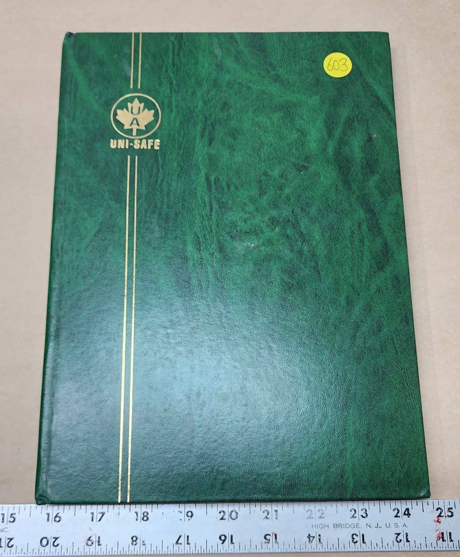 Green "Uni-Safe" stamp book - 4 pages of various stamps