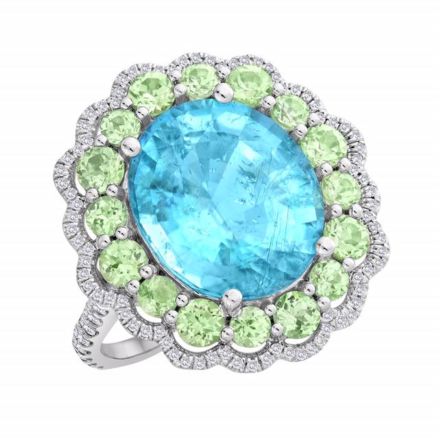 Thia Platinum and 18 K White Gold ring will make you envy by anybody who sees you wearing it. Blue/ Green of Paraiba Tourmaline accented with Grossular garnet makes combination one can't easily forget. Paraiba Tourmaline 7.87 CT's TWGrossular Garnet 2.13 CT'S TW143 Diamonds .50 CT'S