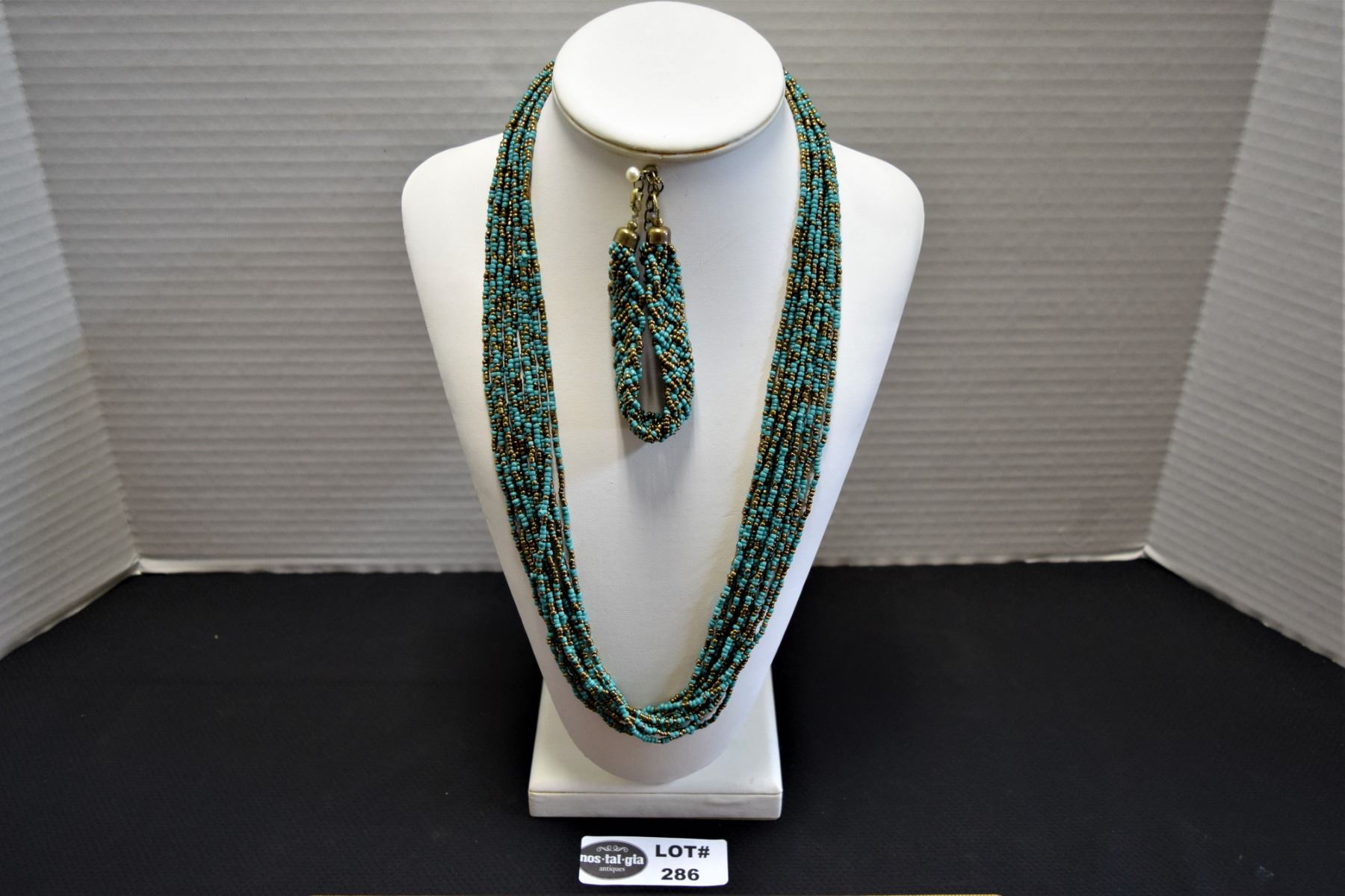Green and Gold Multi-Strand Seed Bead Necklace with Matching Braided Bracelet