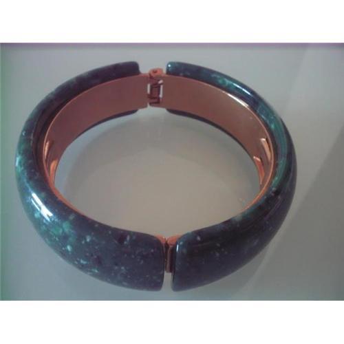 </font></strong>Lovely forest green marbled lucite clamper bangle bracelet. Little flecks of black, pale blue and white on the darker blue background. Interior is gold tone. Will fit any average size wrist. Measures 2-1/2" inches, inside diameter and the width is 1". Excellent condition. </font>