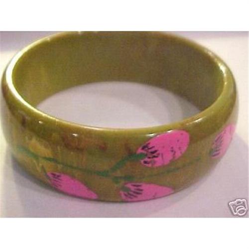 <tr><td>Title:Green and Painted Flower Bakelite Bangle</td></tr>