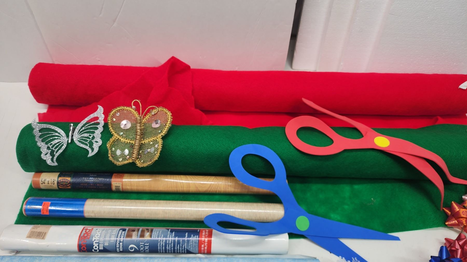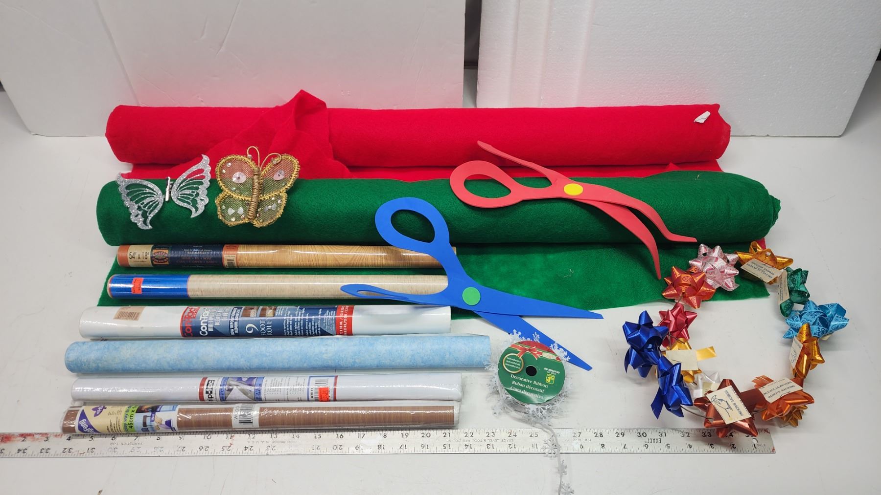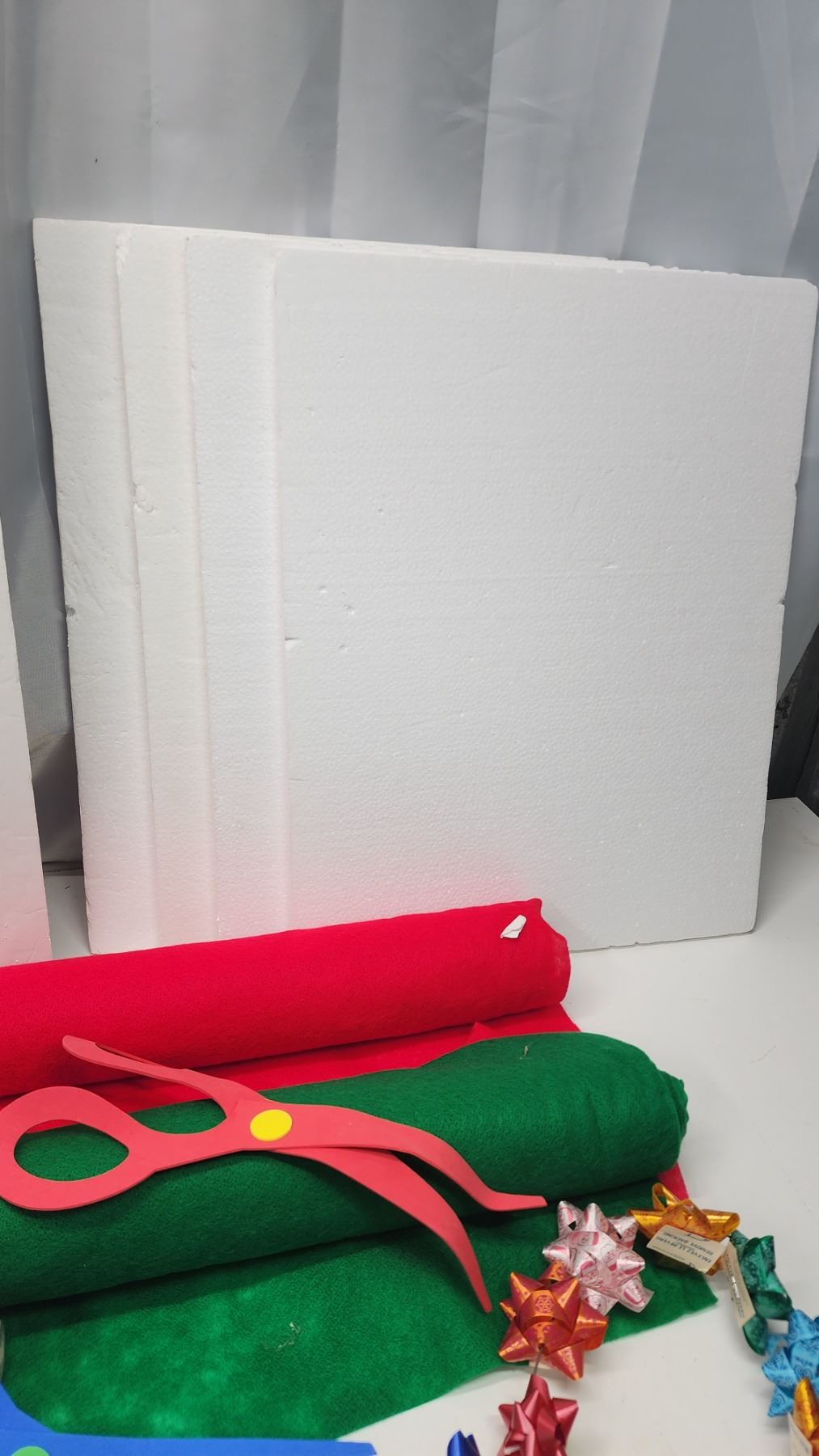 Green and Red Roll of Crafting Felt, 6 Rolls of Grip Tac, Styrofoam and extra crafting supplies