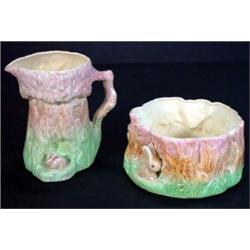 Green and straw glazed Sylvac rabbit design planter and matching jug, impressed marks to base, largest 17cm high