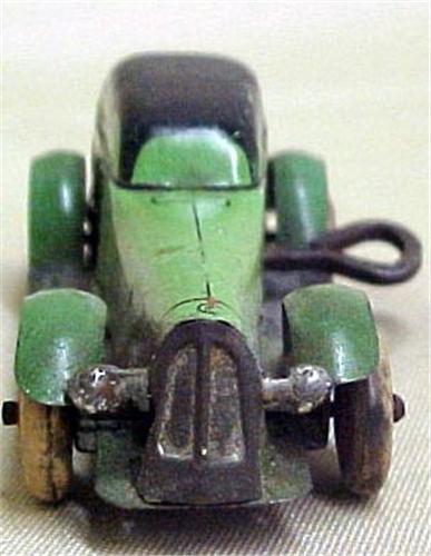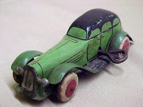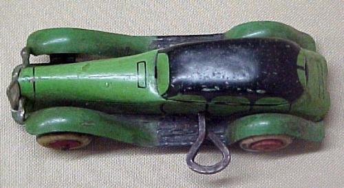 Green car; tin wind-up; Made in U.S.A Lindstrom; working condition; minor paint wear and scratches on top; 4" across.