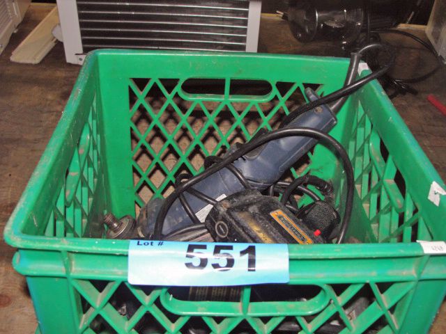 Green dairy crate of assorted power tools