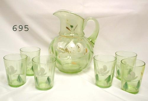 Green enamel decorated water set with 6 tumblers – 1 with chip