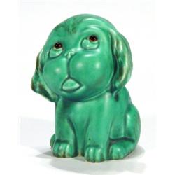 Green glazed Crown Devon seated dog with glass eyes, marks to base, 16cm high