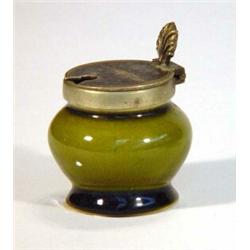 Green glazed Linthorpe Pottery salt with silver plated mount, impressed marks and 1475 to base, 6…