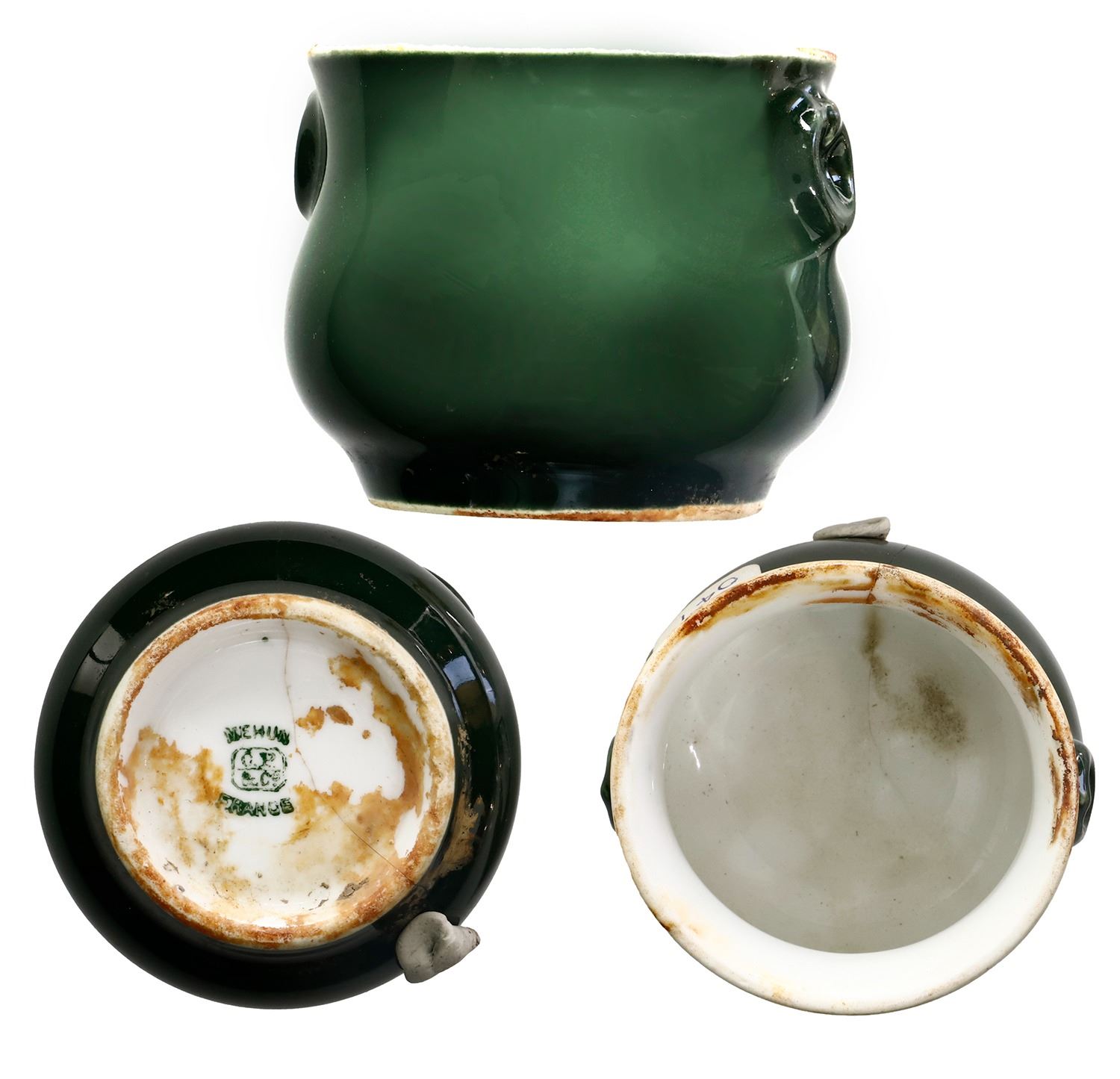 Green-glazed butter pot, ex-Empress of Ireland (1914). 98 grams. 2½" x 2". This wreck is known as "Canada's Titanic," as it was the worst peacetime maritime disaster in Canadian history. In the early hours of May 29, 1914, the fog-shrouded ship was struck midships on its starboard side by the Norwegian collier Storstad. The Empress of Ireland foundered and sank in 14 minutes, with only 465 passengers and crew saved among the 1,477 on board. This little piece, completely intact, bears dark green glazing on the exterior and bright white surfaces on the inside, two little fake handles on either side, with marking on base showing MEHUN above and FRANCE below a logo that says CP&CO for Charles Pillivuyt & Co., a French porcelain maker still in business today. From the Empress of Ireland (1914), with original certificate from the salvor (Bart P. Malone) dated December 2004.
