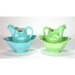 Green iridescent glazed Maling cream jug and sugar bowl and a matching blue glazed sugar bowl and cream jug, marks to bases, largest 14cm high
