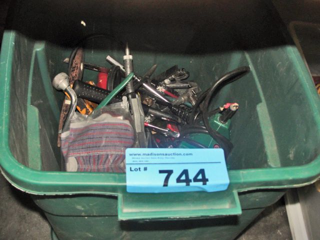 Green rubbermaid container of assorted tools