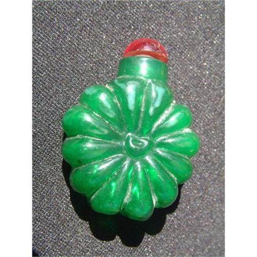 Green Peking glass snuff bottle with a chrysanthemum design. A red color Peking glass stopper complements this exquisite pate du verre art glass snuff bottle. Length: 2.8" (7 cm.). Estimated retail value: $650.