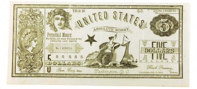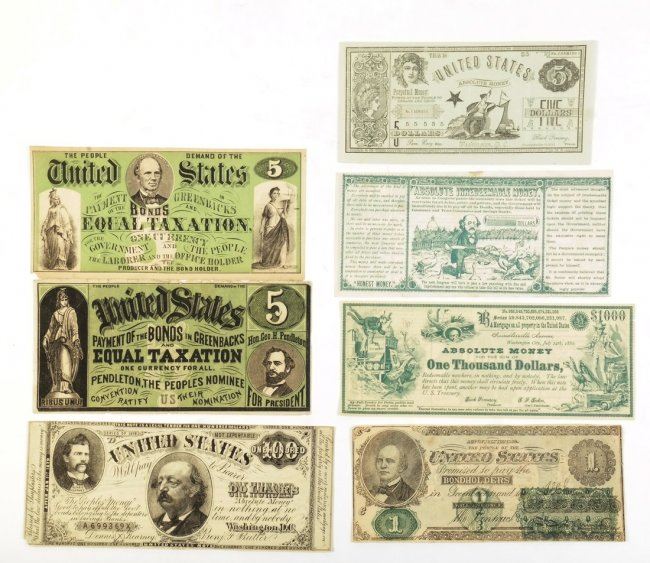 Seven different notes. Includes two large format "Bonds in Greenbacks" types, Butler portrait type, two green "Peoples Money", U.S. bond holders note, and Greenback Platform note. All printed on thin and frail paper with typical nicks, average Fine or better for the types.