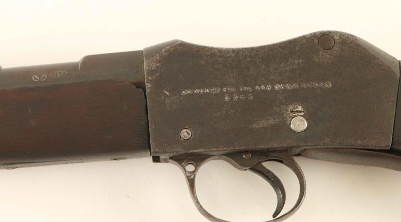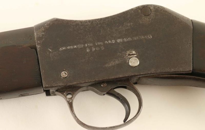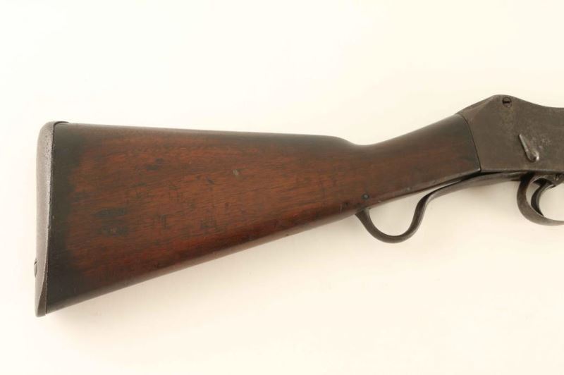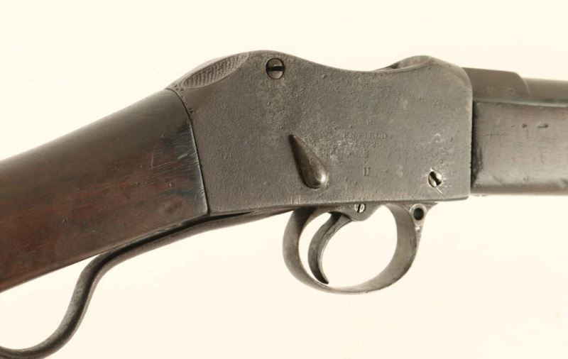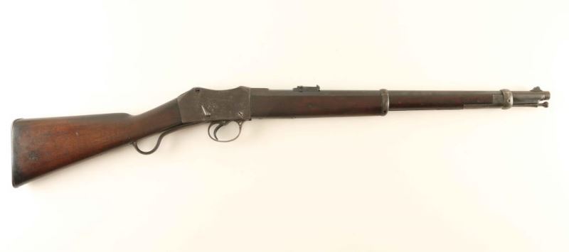 Modified British military lever-operated breech loading single shot service rifle chambered for the .577-450 Martini-Henry cartridge. Manufactured circa 1872. Converted from a Mark II rifle to Calvary Carbine configuration for the English NRA. Features a blued finish with a 21.25" barrel, military style front sight, tangent rear sight graduated to 10,000m, two barrel bands, metal end piece, cleaning rod, serrated trigger, cocked indicator, smooth wood forend and straight grip shoulder stock with metal buttplate. Marked 'Enfield/1872/II' on right side of receiver, 'Converted for the NRA by W.W. Greener/5365' on the left side of the barrel, "***" over the chamber on the barrel, and the stock is marked '2CL/607'. Barrel displays a mostly brown patina with some bright bluing retained in the protected areas and the receiver exhibits pinprick pitting throughout. Action is mechanically sound, bore is very good and the wood stocks are good with small losses. Condition is NRA Fair to Good ***Antique Firearm*** From The John F Sukey Collection