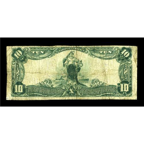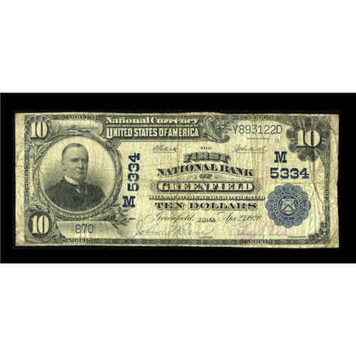 <B>Greenfield, IA</B></I> - $10 1902 Plain Back Fr. 634 <B>The First NB</B></I> Ch. # (M)5334<BR>Large notes only from this bank, with the census standing at just over a dozen pieces. <B>Fine,</B></I> with two color signatures.<BR><BR><b>Shipping:</b> Coins & Currency (<a target="_blank" href="http://www.heritageauctions.com/common/shipping.php">view shipping information</a>)