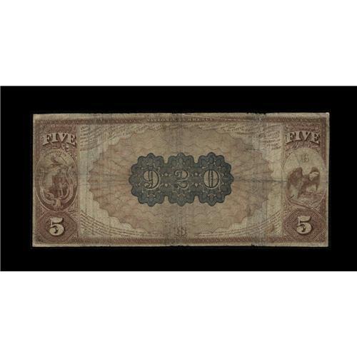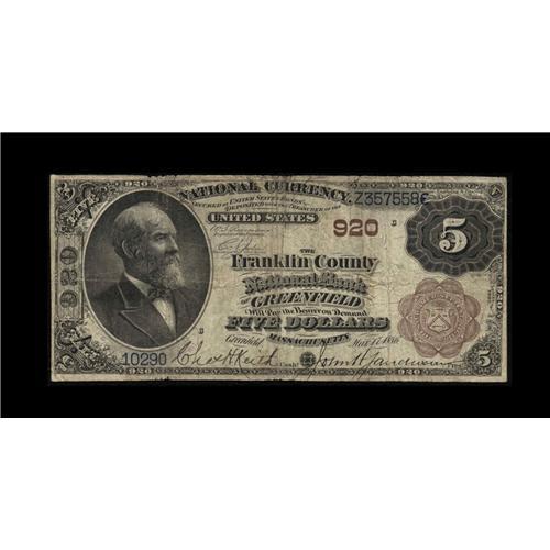 <B>Greenfield, MA</B></I> - $5 1882 Brown Back Fr. 469 <B>The Franklin County NB</B></I> Ch. # 920<BR>The addition of this note would bring the total known to 10 Large. This colorful note with strong signatures has some minor edge roughness with a small fold tear into the design. <B>Fine.</B></I>