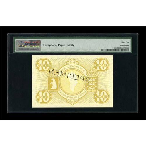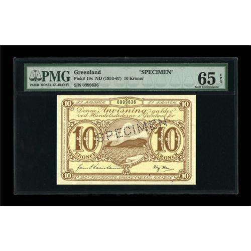 <B>Greenland</B></I> 10 Kroner ND (1953-67) Specimen Pick 19s<BR> This lovely specimen note is well margined and tonight a value will be established for this elusive issue. <B>PMG Gem Uncirculated 65 EPQ.</B></I><BR><BR><b>Shipping:</b> Coins & Currency (<a target="_blank" href="http://www.heritageauctions.com/common/shipping.php">view shipping information</a>)