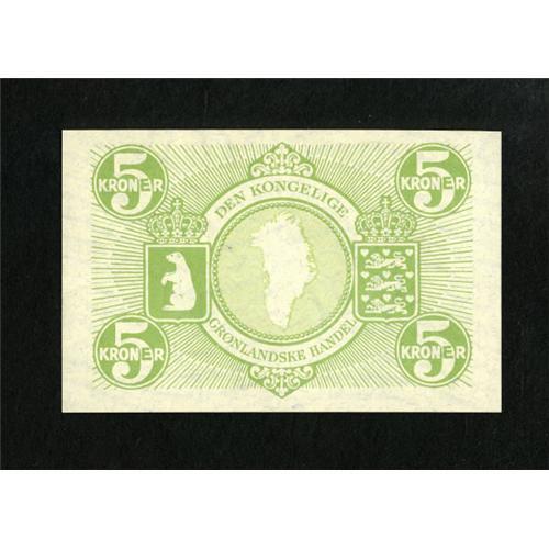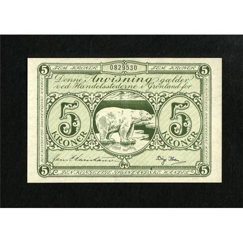 <B>Greenland </B></I>5 Kroner (1953-1967) Pick 18a<BR> This note screams Greenland with its polar bear vignette on the face and then there is the map of Greenland on the back. <B>Choice Crisp Uncirculated.</B></I><BR><BR><b>Shipping:</b> Coins & Currency (<a target="_blank" href="http://www.heritageauctions.com/common/shipping.php">view shipping information</a>)