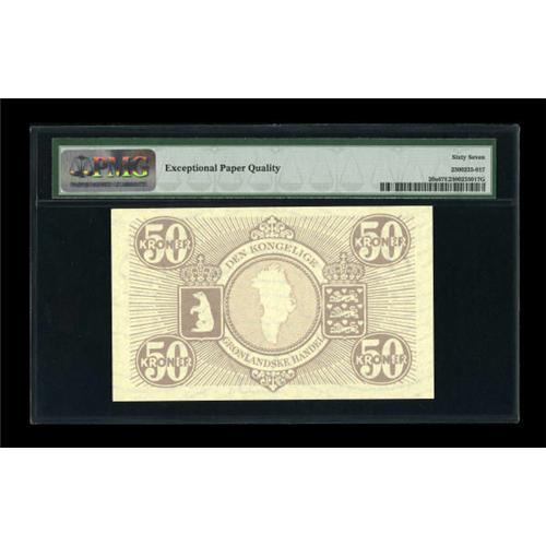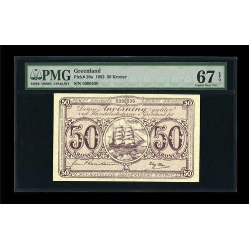 <B>Greenland</B></I> 50 Kroner 1953 Pick 20a<BR> Large margins grace this colorful note rarely available in this state of preservation. <B>PMG Superb Gem Unc 67 EPQ.</B></I><BR><BR><b>Shipping:</b> Coins & Currency (<a target="_blank" href="http://www.heritageauctions.com/common/shipping.php">view shipping information</a>)