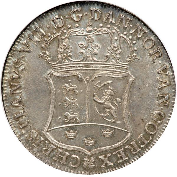 Of this issue only 543 pieces were struck in 1771, with the bulk of the issue being restruck in 1774. Discerning between the two emissions by die combination analyses, it has has been determined that only 5 of the 1771 strikes are known. Of 1774 mintage, which comprised some 44,900 pieces, only 20 pices are known to have survived. Of these, half are in museum collections. Truly one of the ultimate classic numismatic rarities. This self same coin being used to illustrate the issue in the website by Niels J. Jensen & M. Skjoldager, Dansk Mønt ("Danish Coins") at www.gladsaxegymnasium.dk .