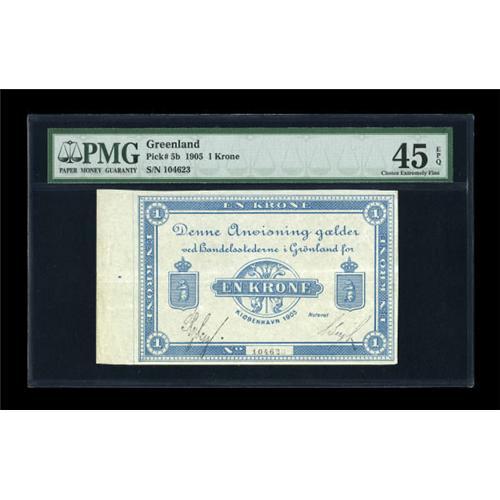 <B>Greenland</B></I> Handelsstederne I Gronland 1 Krone 1905 Pick 5b<BR> An extremely wide left margin draws attention to this lightly circulated note. <B>PMG Choice Extremely Fine 45 EPQ.</B></I><BR><BR><b>Shipping:</b> Coins & Currency (<a target="_blank" href="http://www.heritageauctions.com/common/shipping.php">view shipping information</a>)