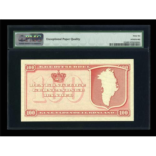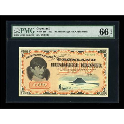 <B>Greenland</B></I> Kreditseddel 100 Kroner 1953 Pick 21b<BR> Hans C. Christensen is the signer of this well margined note. <B>PMG Gem Uncirculated 66 EPQ.</B></I><BR><BR><b>Shipping:</b> Coins & Currency (<a target="_blank" href="http://www.heritageauctions.com/common/shipping.php">view shipping information</a>)