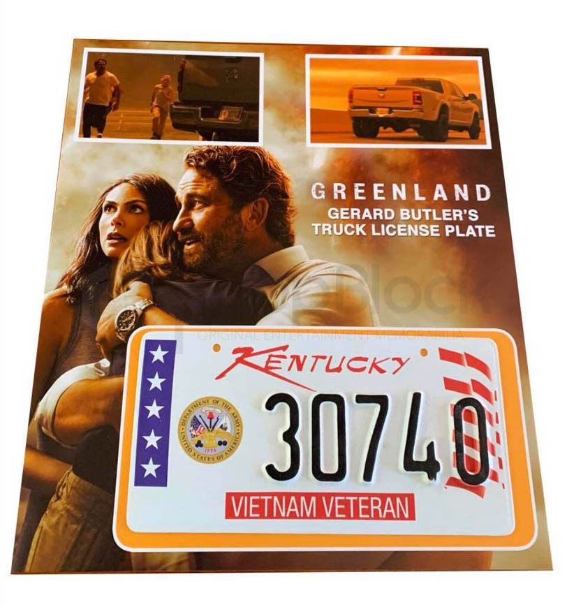 License plate display featured in the production of the 2020 action disaster film Greenland. A family struggles for survival in the face of a cataclysmic natural disaster. This plate was used on Gerard Butler's truck in the film and is made of vacuformed plastic with red, white and black detailing. This item features a custom made display and remains in excellent, production used condition.
