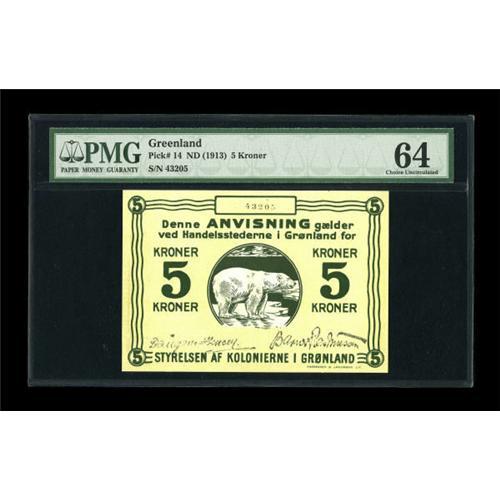 <B>Greenland </B></I>State Note 5 Kroner ND (1913) Pick 14<BR> A tiny notch is seen along the top margin on this popular Polar Bear issue. <B>PMG Choice Uncirculated 64.</B></I><BR><BR><b>Shipping:</b> Coins & Currency (<a target="_blank" href="http://www.heritageauctions.com/common/shipping.php">view shipping information</a>)