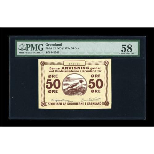 <B>Greenland</B></I> State Note 50 Ore ND (1913) Pick 12<BR> A little light handling is all that is visible on this example featuring a saddleback seal vignette.<B> PMG Choice About Unc 58.</B></I><BR><BR><b>Shipping:</b> Coins & Currency (<a target="_blank" href="http://www.heritageauctions.com/common/shipping.php">view shipping information</a>)