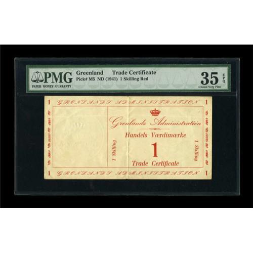 <B>Greenland</B></I> Trade Certificate 1 Skilling ND (1941) Pick M5<BR> A heavy center fold and some light handling have not adversely affected this note. <B>PMG Choice Very Fine 35 EPQ.</B></I><BR><BR><b>Shipping:</b> Coins & Currency (<a target="_blank" href="http://www.heritageauctions.com/common/shipping.php">view shipping information</a>)