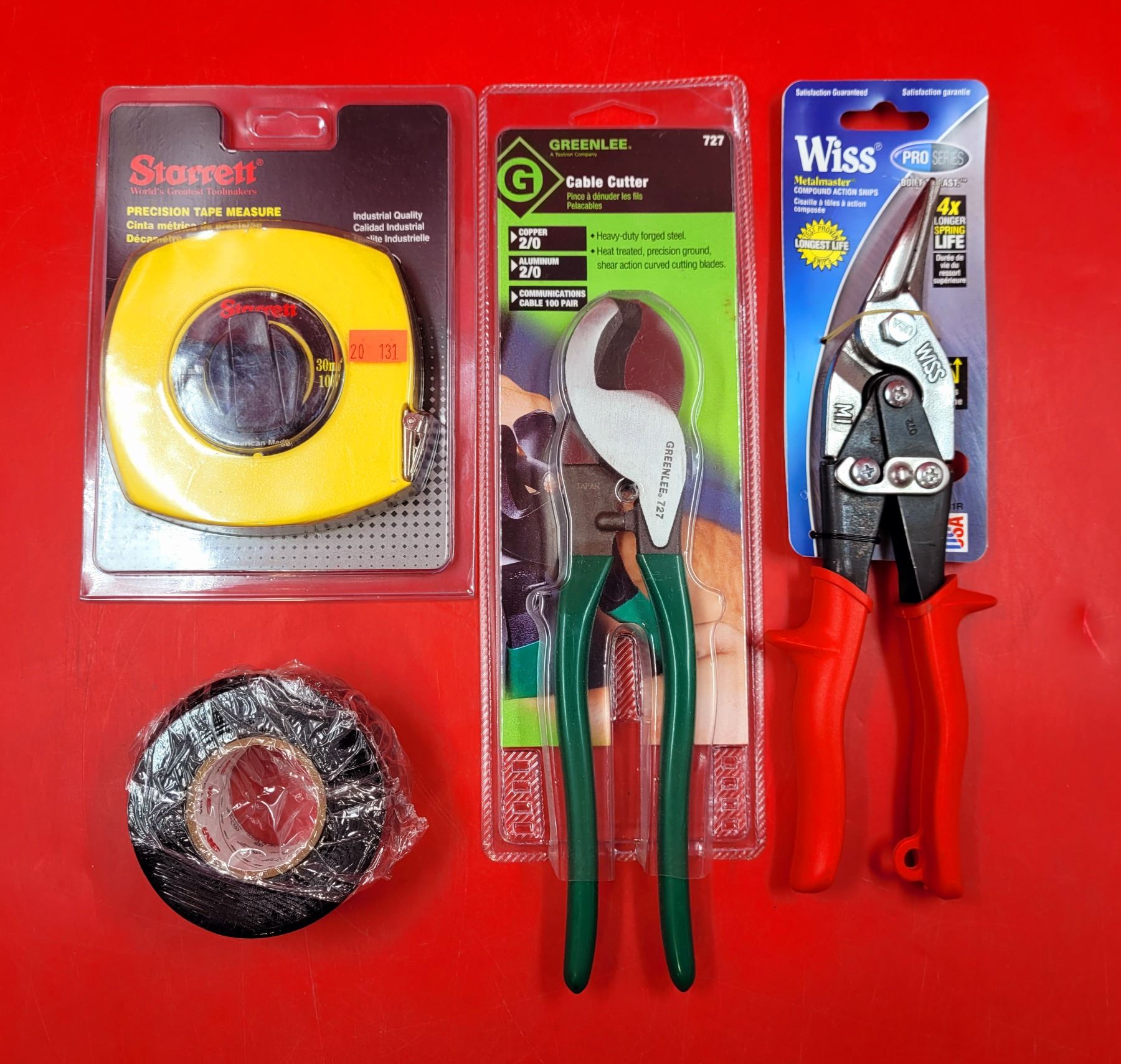 Greenline Cable Cutter, Compound Action Snips, Precision Tape Measure & Black Electrical Tape