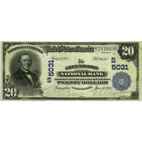 <B>Greensboro, NC</B></I> - $20 1902 Plain Back Fr. 658 <B>The Greensboro NB</B></I> Ch. # (S)5031<BR>This is actually a tougher type from this better Greensboro bank, with no offerings of any Blue Seals at public sale since 1998. <B>Fine-Very Fine.</B></I>