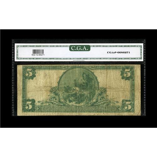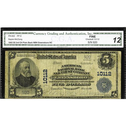 <B>Greensboro, NC</B></I> - $5 1902 Plain Back Fr. 602 <B>American NB & TC</B></I> Ch. # 10112<BR>Third title notes from this institution are just plain tough with this example becoming only the fifth known. Graded CGA <B>Fine 12.</B></I>