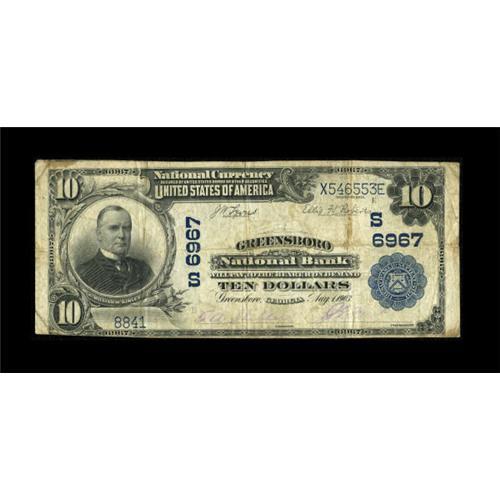 <B>Greensborough, GA</B></I> - $10 1902 Plain Back Fr. 624 <B>Greensborough NB</B></I> Ch. #(S)6967<BR> Large notes only were issued from here, with a census of only five notes reported. We were able to offer two notes from this bank, including this note, in our 2004 FUN sale of the Rome collection. <B>Fine+</B></I>,<B> </B></I>trimmed in just a bit at the bottom.<B></B></I><BR><I>From The Amelia Island Collection.</B></I><BR><BR><b>Shipping:</b> Coins & Currency (<a target="_blank" href="http://www.heritageauctions.com/common/shipping.php">view shipping information</a>)