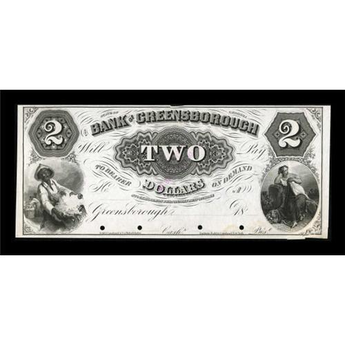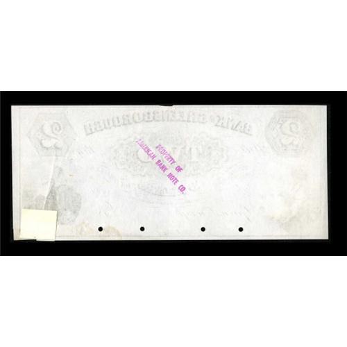 <B>Greensborough, GA- Bank of Greensborough </B></I>$2 18__ G4d Proof<BR> This proof came from the ABNCo archives and it has the customary ABNCo rubber stamping on the back. This <B>Crisp Uncirculated </B></I>proof has four punch cancels along the signature lines as made and there is a small nick at top center. There is also a small repair in the back lower left corner.<BR><I>From The Collection of a Louisiana Gentleman</B></I><BR><BR><b>Shipping:</b> Coins & Currency (<a target="_blank" href="http://www.heritageauctions.com/common/shipping.php">view shipping information</a>)