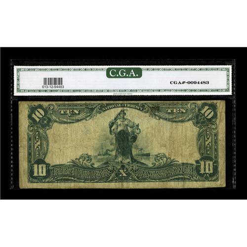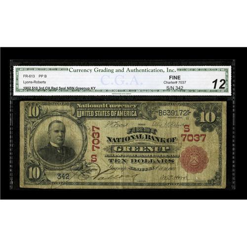 <B>Greenup, KY</B></I> - $10 1902 Red Seal Fr. 613 <B>The First NB</B></I> Ch. #(S)7037<BR>A scarce Kentucky Red Seal $10 certified as <B>CGA Fine 12.</B></I> The census from here includes only six large size notes of all varieties. A scant two are of the Red Seal persuasion, this $10 and a single $20. The particular note we bring to the collecting fraternity this evening was previously sold in St. Louis in 2002. It went for $4,888. The market for rare Nationals is considerably more robust now than when this prohibitively rare Red Seal was previously hammered down. We fully expect that the previous realization will be nothing more than a rather timid starting point for bids tonight.<BR><BR><b>Shipping:</b> Coin/Currency (<a target="_blank" href="http://www.heritageauctions.com/common/shipping.php">view shipping information</a>)