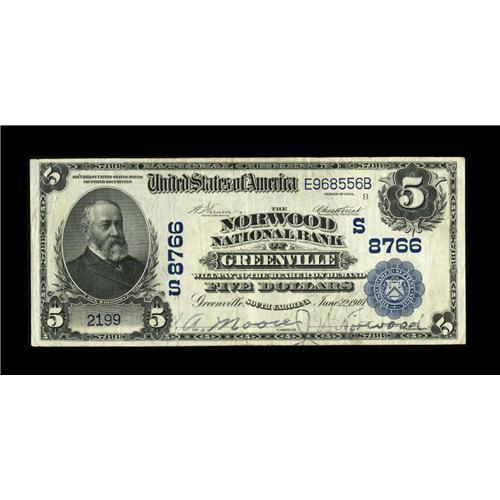 <B>Greenville, SC</B></I> - $5 1902 Date Back Fr. 592 <B>The Norwood NB</B></I> Ch. # (S)8766<BR>This is the only $5 Date Back from here listed in the census, and it's one of the nicest large notes we've ever seen from this South Carolina private name bank. Sharp <B>Very Fine,</B></I> with the appearance of an even higher grade note and the signature of J.W. Norwood as President.<BR><BR><b>Shipping:</b> Coin/Currency (<a target="_blank" href="http://www.heritageauctions.com/common/shipping.php">view shipping information</a>)