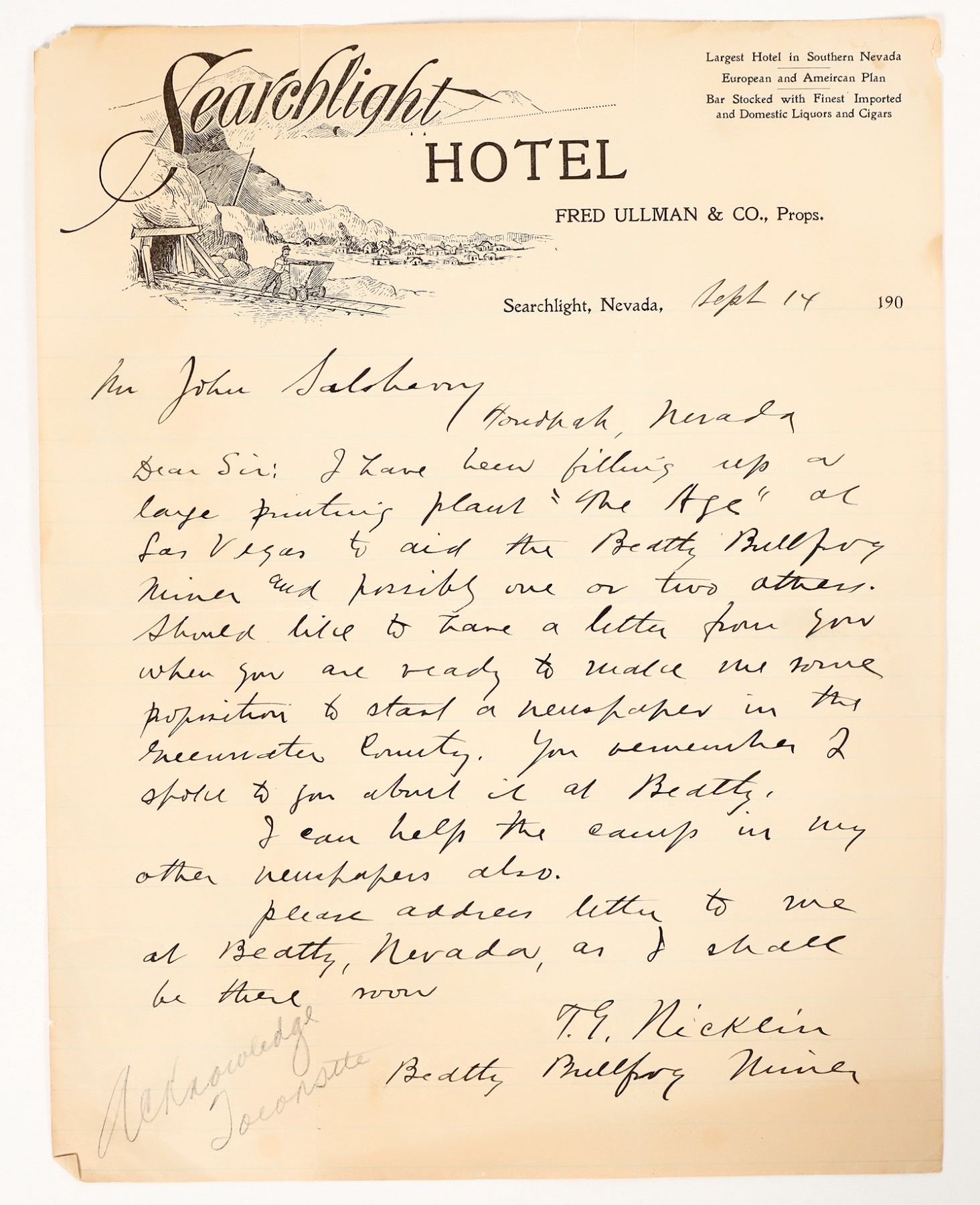 One page letter addressed to John Salisbury on Searchlight hotel pictorial letterhead written by TG Nicklin proprietor of the Beatty Bullfrog Miner. Discusses printing the Las Vegas age to aid the Bullfrog Miner. He wants to know when Salsbury will be ready to start a paper in Greenwater. Important letter, Greenwater didn't last long.