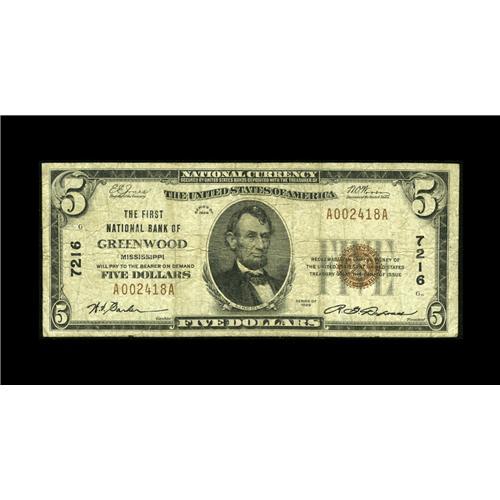<B>Greenwood, MS</B></I> - $5 1929 Ty. 1 <B>The First NB</B></I> Ch. # 7216<BR>The receiver took control of this institution on December 27, 1930, leaving LeFlore County without a federally chartered banking institution, the only other issuer in the county having closed the previous June. The note we make available tonight grades <B>Fine</B></I> and is free of any pinholes. While certainly not a rarity, it is scarce enough to be worth in the range of...
