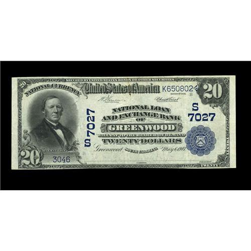 <B>Greenwood, SC</B></I> - $20 1902 Date Back Fr. 644 <B>National Loan & Exchange Bank</B></I> Ch. # (S)7027<BR>A high end note from a very tough bank, with less than a dozen large examples reported and even fewer small. Sharp <B>Very Fine-Extremely Fine,</B></I> as nice as any large example we know of from here.