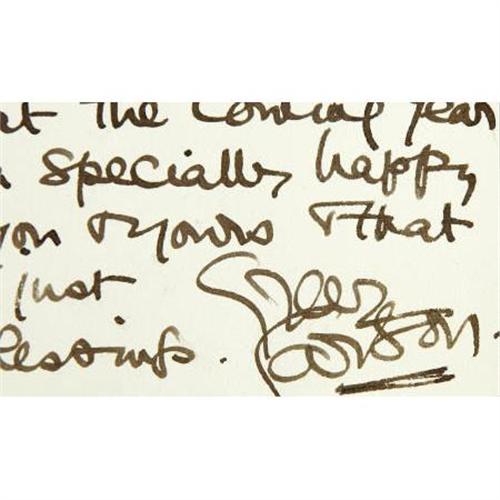 <B>Greer Garson Handwritten Letter to Emile LaVigne.</B></I> A thank-you note on personal stationery, dated December 29, 1944, from Garson to make-up artist Emile LaVigne, handwritten and signed by her in black ink. It reads in part: "How very nice of you to send me this pretty flowered scarf -- it makes a most becoming addition to my collection, as you'll see for yourself I hope when we start work on the next pic." In Excellent condition with very mild wear and toning. <I>From the Emile LaVigne Estate.</B></I><BR><BR><b>Shipping:</b> Flat Material, Small (<a target="_blank" href="http://www.heritageauctions.com/common/shipping.php">view shipping information</a>)