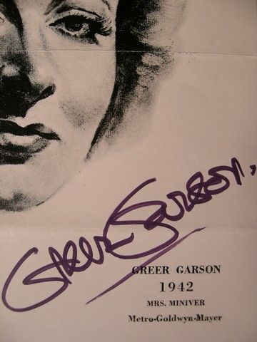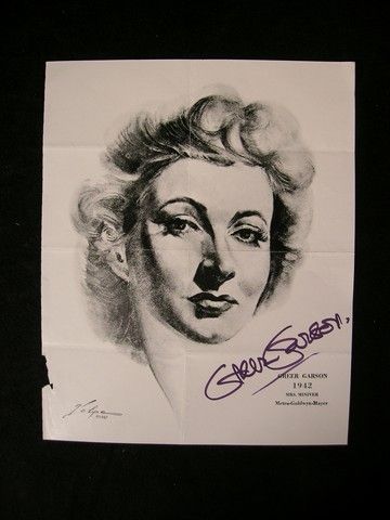 From the William Wyler romantic-drama 'Mrs. Miniver,' this is a lifelike, drawn portrait of actress Greer Garson from the 1942 film. The photo is a beautiful rendition of the famed actress and is signed in purple ink by the star herself. (measures approx. 8"x 10")